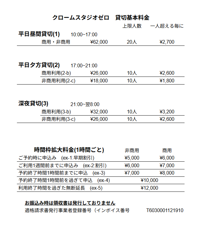 (前日や当日予約、また機材や人数追加、延長などの追加費用は当日現金にてお支払い)